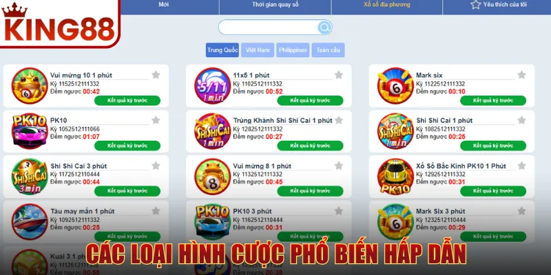 Trong sảnh TP Xổ Số KING88 hội viên có thể lựa chọn từ nhiều hình thức cược khác nhau. Thay vì chỉ tập trung vào một loại cược, hãy thử đa dạng hóa lựa chọn của mình. Ví dụ, bạn có thể tham gia chơi lô, chơi đề, hoặc thậm chí thử sức với lô xiên và lô kép.